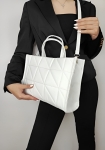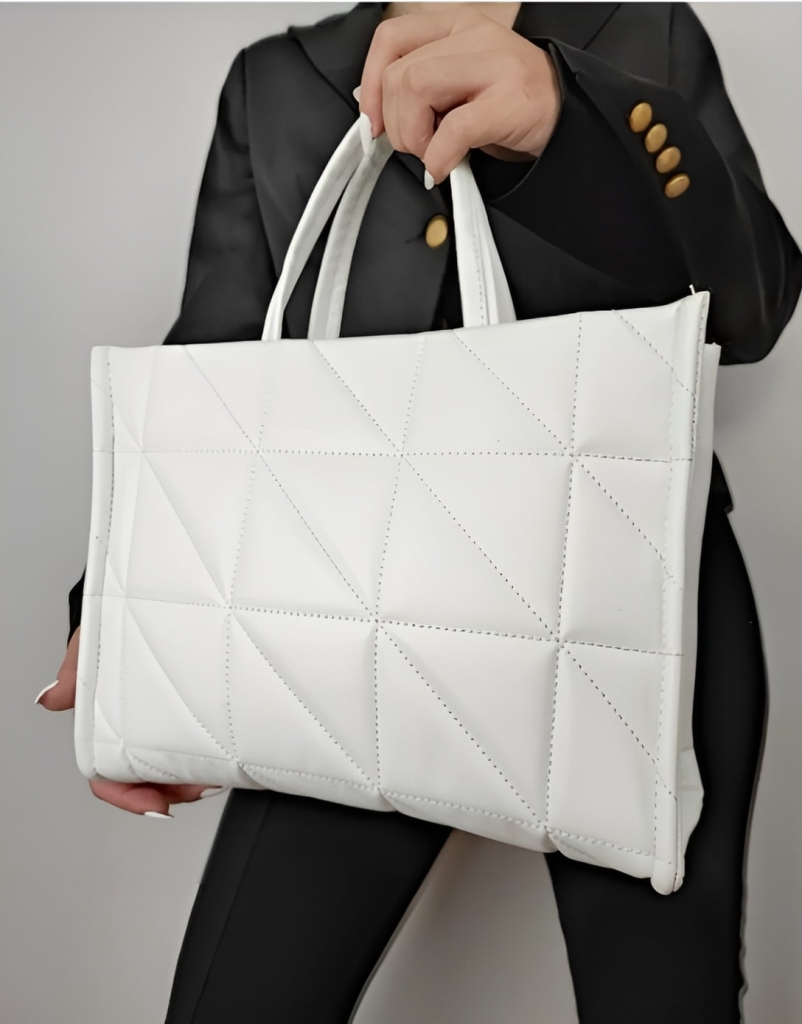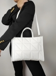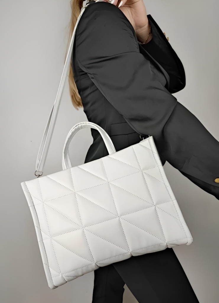 Сумка має форму прямокутника і стьобана у ромбоподібний візерунок, що додає їй цікавого візуального акценту. Вона виконана в білому кольорі, що надає їй свіжого і легкого вигляду, що підходить для літніх і повсякденних образів.