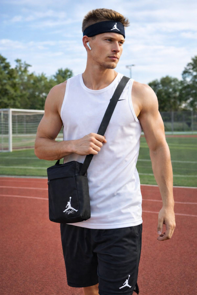Чоловіча спортивна сумка через плече Jordan – аксесуар для чоловіків. Зручний та практичний, він має регульовану довжину ременя для найкращого комфорту. Розміри сумки складають 22x19x5 см, у неї три відділення для зручного розташування різноманітних речей. Матеріал – надійний поліестер, що гарантує якість та тривалу службу."
