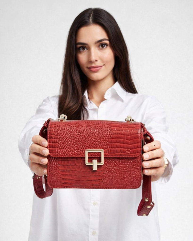 Стильна сумка бордового кольору зі штучної шкіри з принтом крокодила, розмірами 17*21*6, створена для виразного образу. Ремінь регулюється, щоб забезпечити максимальний комфорт. Якісна підкладка всередині додає якість та стиль цій унікальній сумці, роблячи її аксесуаром для важливих подій та повсякденного використання