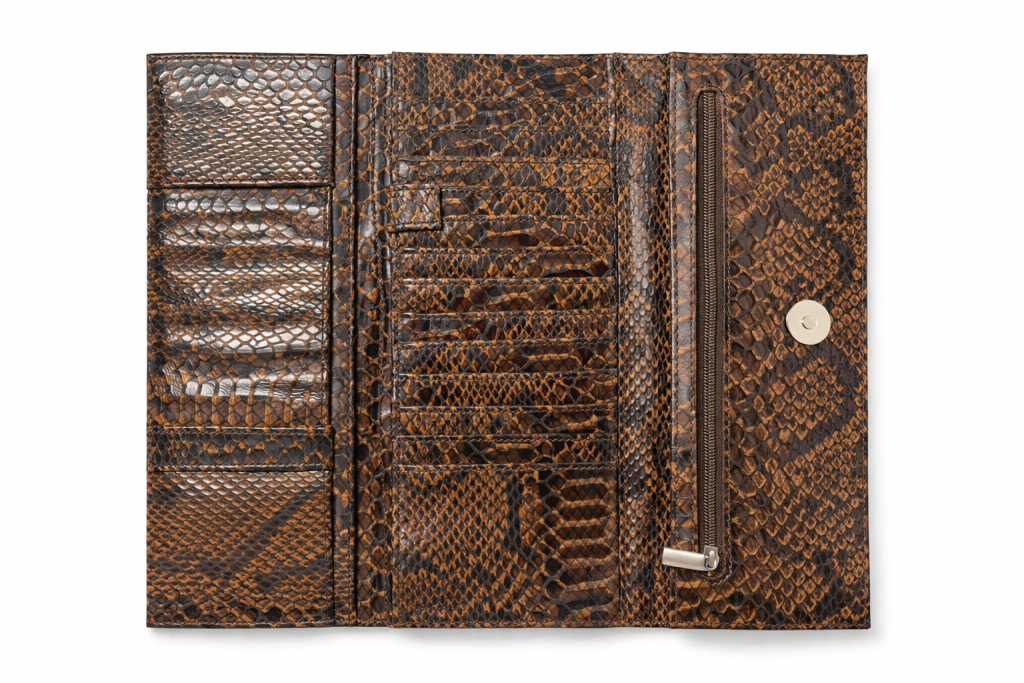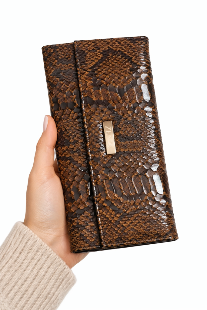 Стильний гаманець-клатч із екошкіри з тисненням під пітона. Коричневий відтінок з легким глянцем виглядає елегантно та підходить до будь-якого образу. Зручний формат дозволяє комфортно зберігати купюри та картки, а металева декоративна вставка додає аксесуару преміального вигляду.